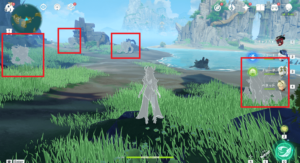 この時に気づいたのですが、その時の元素付着状態で色が変わるようです!上記は海辺で「水元素付着状態」のため、白色ではなく水色になっています。