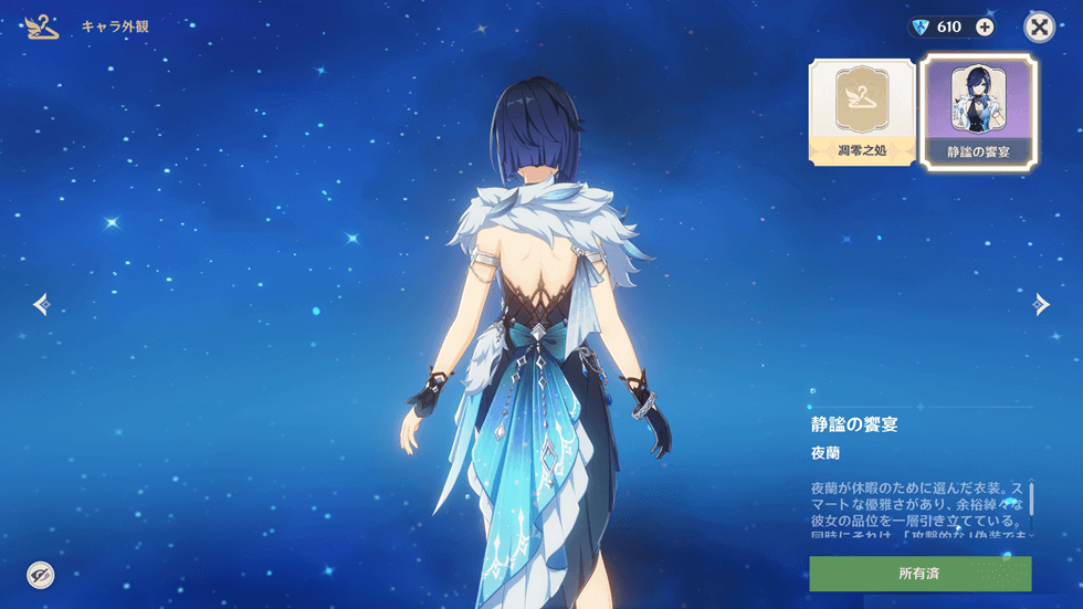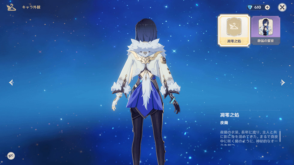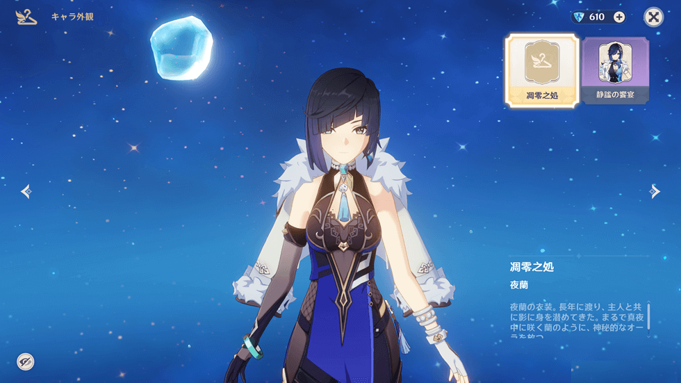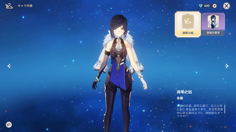 「夜蘭」だけでなく「甘雨」などVer1.x世代のキャラでも同様に、新コスチュームの装着でモデリングが非常にきれいになっています。