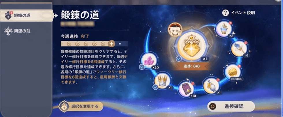 - 鍛錬の道は12週周期で週5日以上条件クリア×8週で「キャラの凸アイテム(星屑)」が獲得できる!