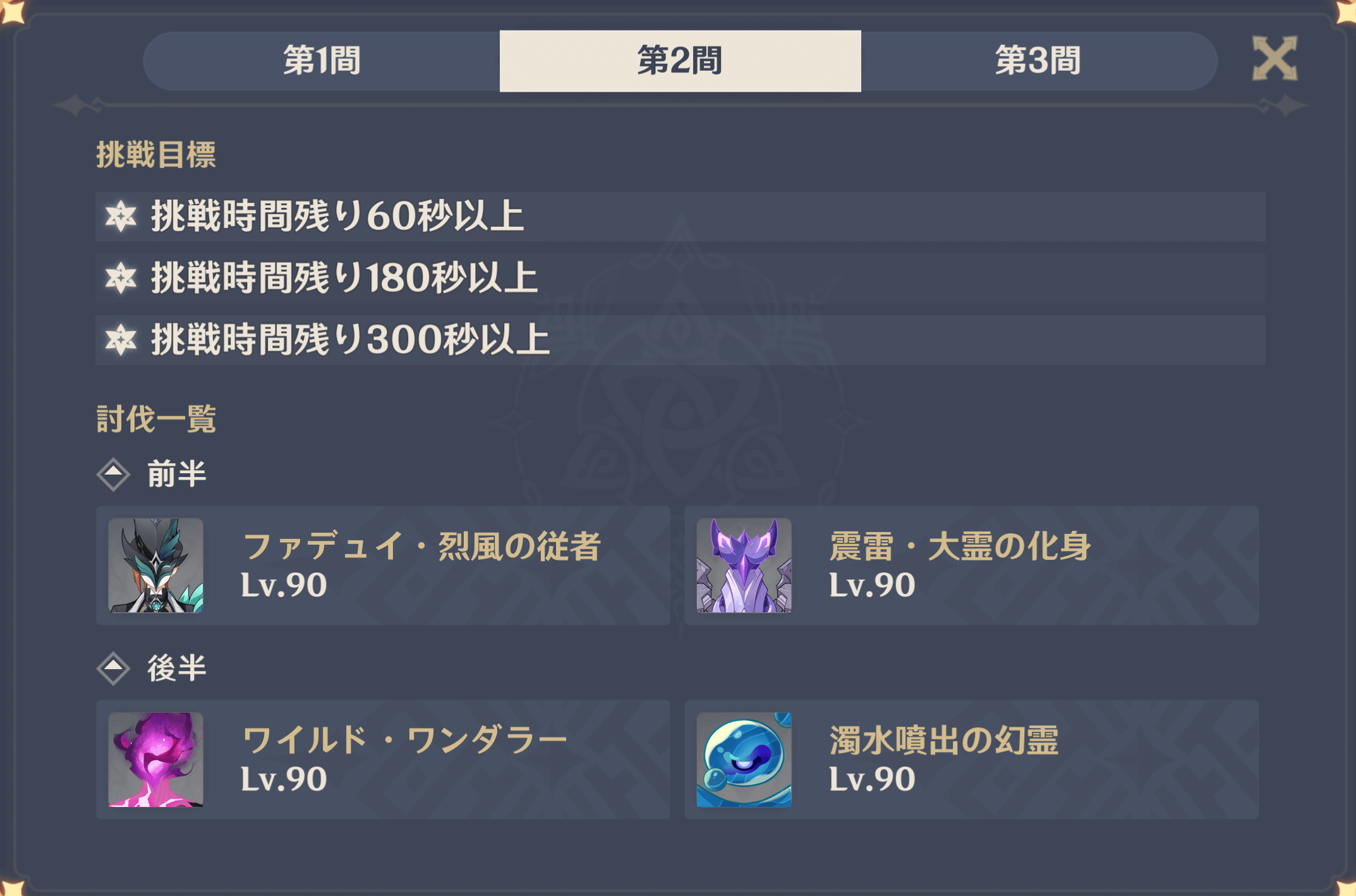 今期の祝福が「感電」+「開花」となっていたため、前半は「水元素+草元素」で構成し後半は「雷元素+水元素」で構成いたしました!
