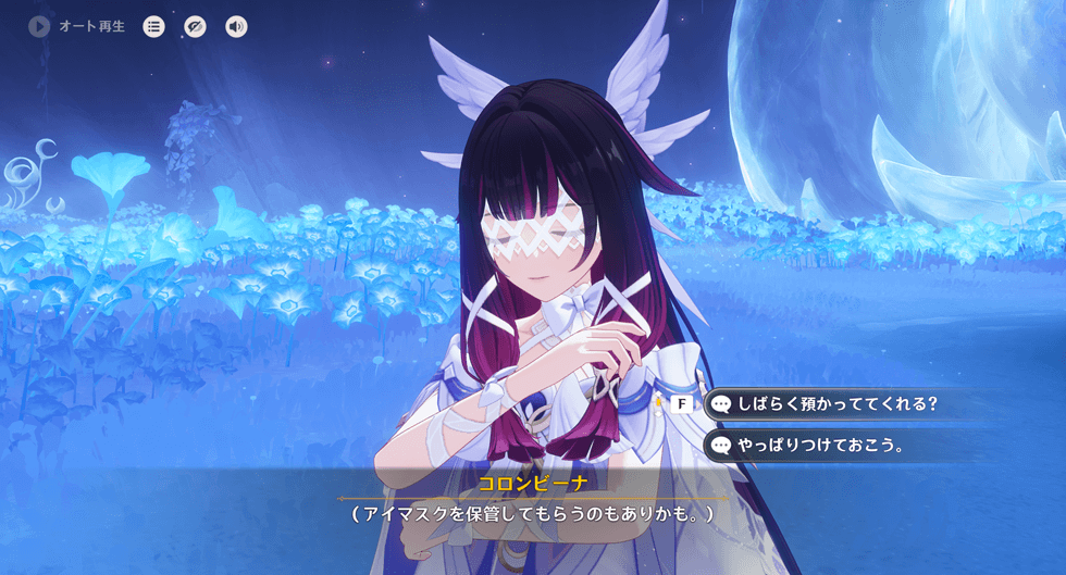 • 銀月の庭で月霊に話掛けることで、アイマスクを外せる