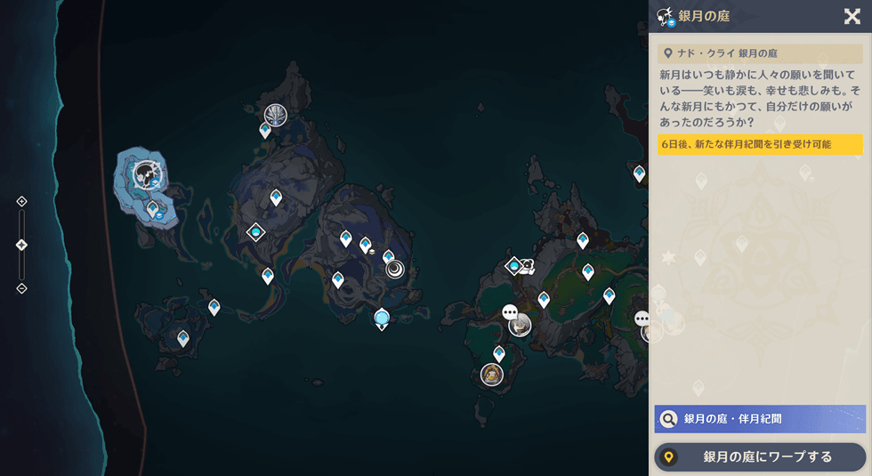 場所はナドクライの「銀月の庭」で「魔神任務空月の歌二幕「塵と灯のエレジー」 の「記憶の裏を覗いて」をクリア」で解放されます。
